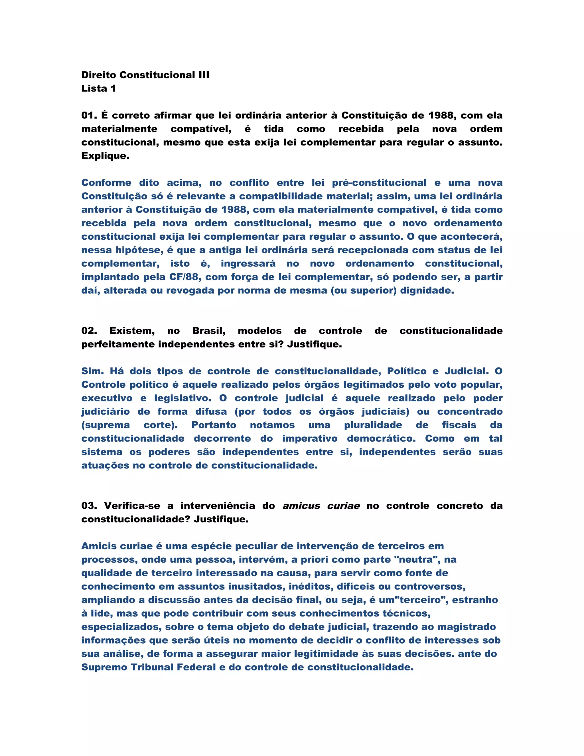 Este documento apresenta uma lista de questões sobre direito constitucional e controle de constitucionalidade no Brasil. As questões discutem tópicos como a recepção de leis pré-constitucionais, modelos de controle de constitucionalidade, intervenção do amicus curiae, legitimidade para propositura de Ação Direta de Inconstitucionalidade e outros aspectos do controle de constitucionalidade brasileiro.