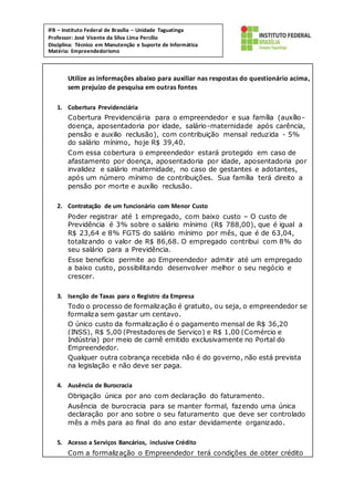 O documento discute os benefícios do MEI (Microempreendedor Individual), incluindo cobertura previdenciária para o empreendedor e sua família, contratação de funcionários com baixo custo, e custos mensais fixos de R$ 36,20 a R$ 41,20. Também aborda ausência de burocracia, acesso a serviços bancários e crédito, compras e vendas em conjunto, e apoio técnico do SEBRAE.