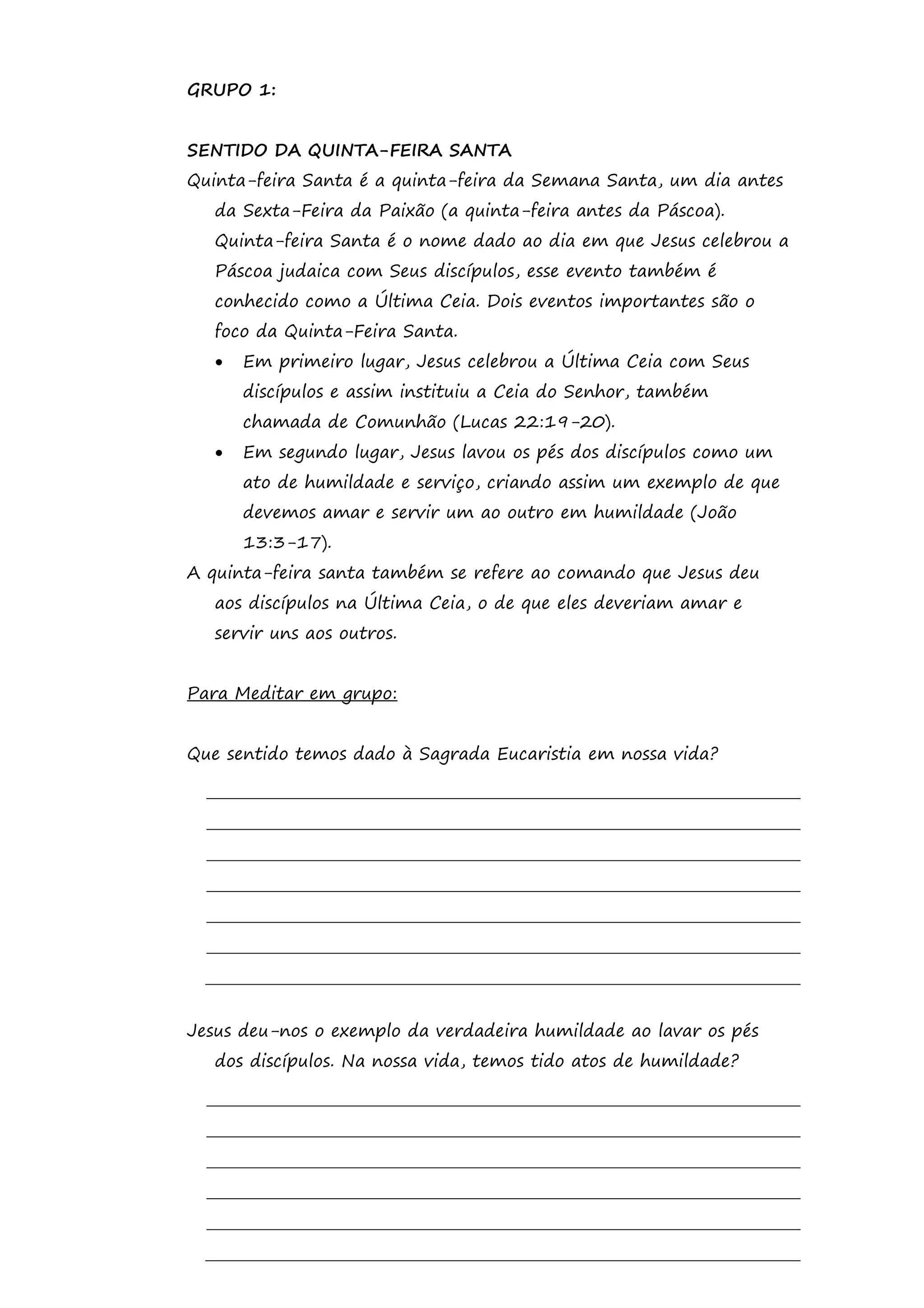 O documento descreve o significado de três dias da Semana Santa: Quinta-feira Santa, quando Jesus celebrou a Última Ceia; Sexta-feira Santa, quando se comemora a paixão e morte de Jesus; e Sábado Santo, quando a Igreja aguarda em oração a ressurreição de Cristo.