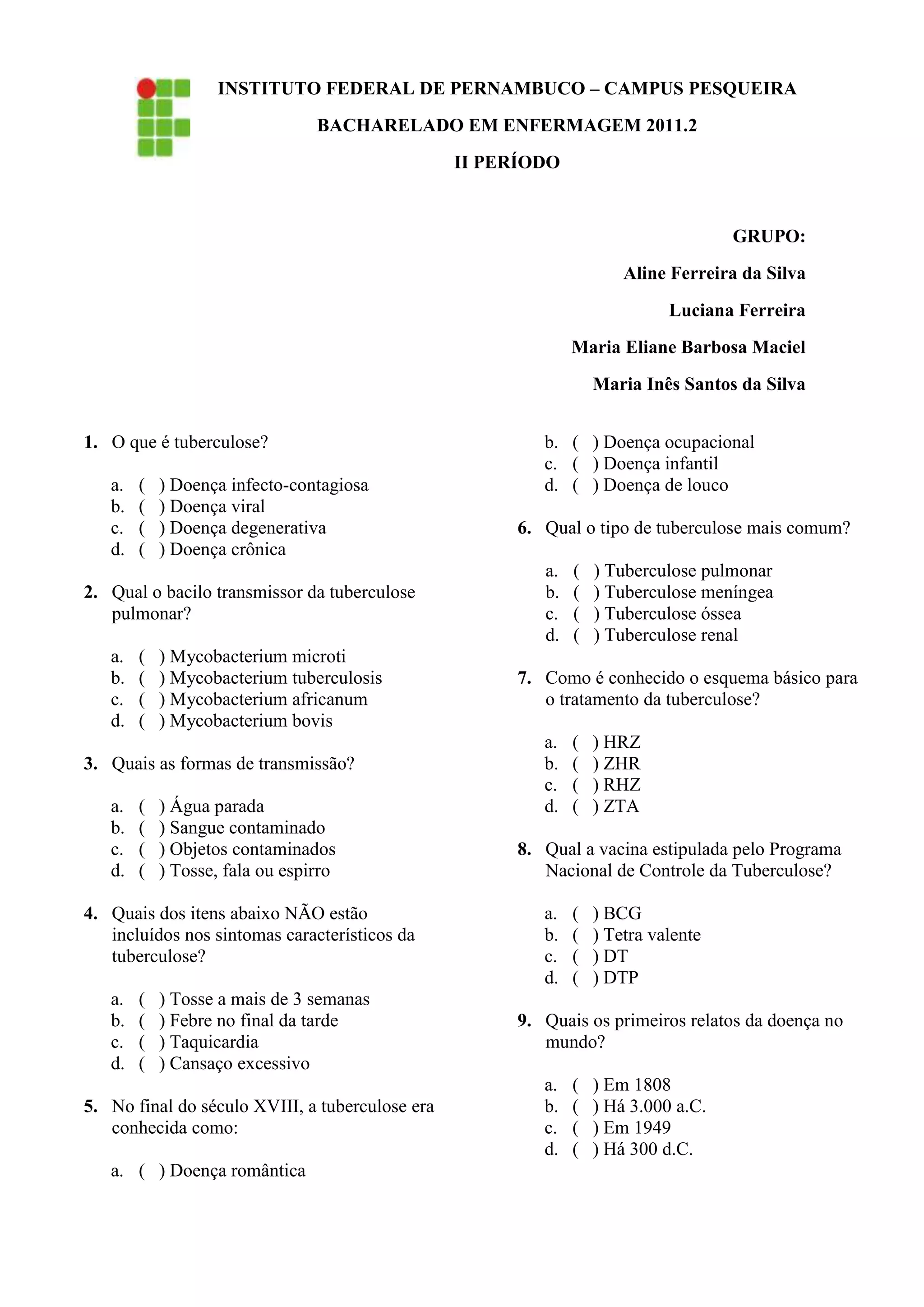 (1) O documento é um questionário sobre tuberculose aplicado a estudantes de enfermagem. (2) A tuberculose é uma doença infecto-contagiosa causada pelo bacilo Mycobacterium tuberculosis, que se transmite principalmente por tosse e espirro. (3) O diagnóstico é feito inicialmente por raio-x e baciloscopia e o tratamento dura pelo menos 6 meses.