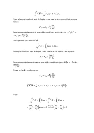 O documento demonstra que o rotacional de uma força conservativa é nulo. Ele faz isso calculando o rotacional ao longo de caminhos fechados em diferentes planos utilizando a aproximação de Taylor e a noção de sentidos dos eixos, mostrando que cada integral se anula.