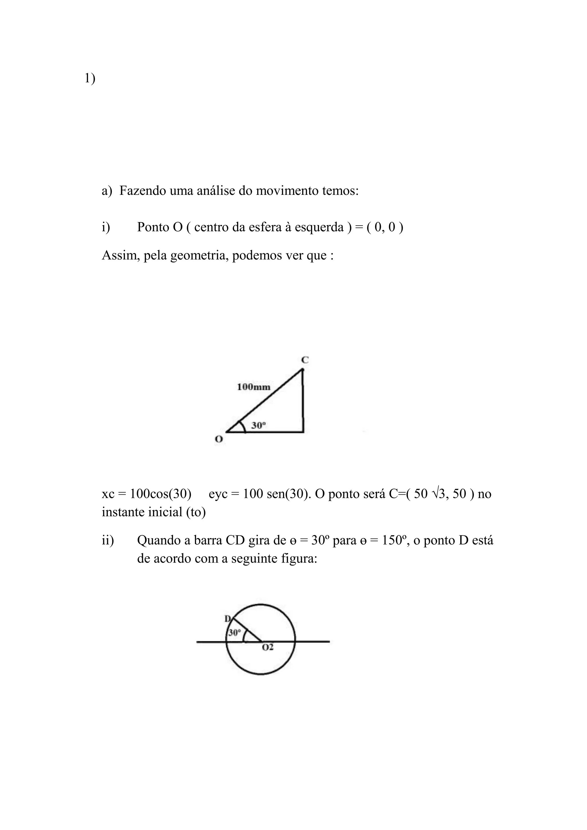 1) O documento descreve o movimento de um ponto P em uma esfera giratória. P se move de C para D quando a barra gira de 30° para 150°.