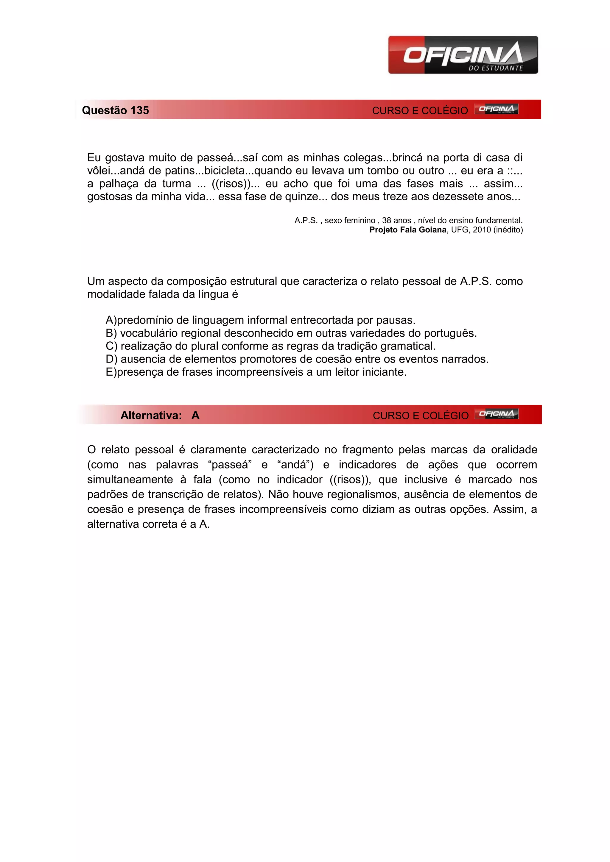 A.P.S. descreve com nostalgia a fase entre os 13 e 17 anos, quando gostava de brincar com as amigas na porta de casa, jogar vôlei, andar de patins e bicicleta. Ela se identificava como a "palhaça da turma". O relato é caracterizado pela linguagem informal e entrecortada típica da oralidade.