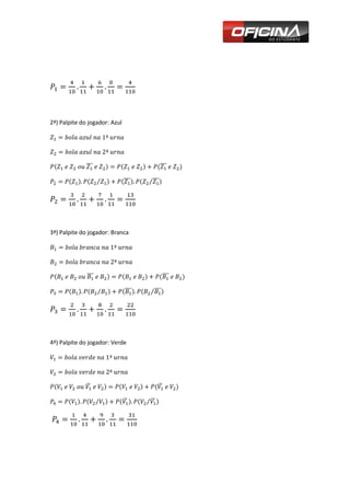 O documento descreve um jogo com duas urnas contendo bolas de cores diferentes. Pelo jogo, uma bola é movida da urna 1 para a urna 2 e então uma bola é retirada da urna 2. Se a cor correspondente ao palpite do jogador, a probabilidade maior de acerto é vermelha, pois inicialmente havia 4 bolas vermelhas na urna 2.