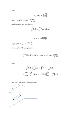 O documento demonstra que o rotacional de uma força conservativa é nulo através de cálculos de integrais de linha. Ele calcula as integrais de linha ao redor de dois caminhos fechados diferentes para mostrar que o resultado é sempre zero, indicando que o rotacional é nulo para forças conservativas.