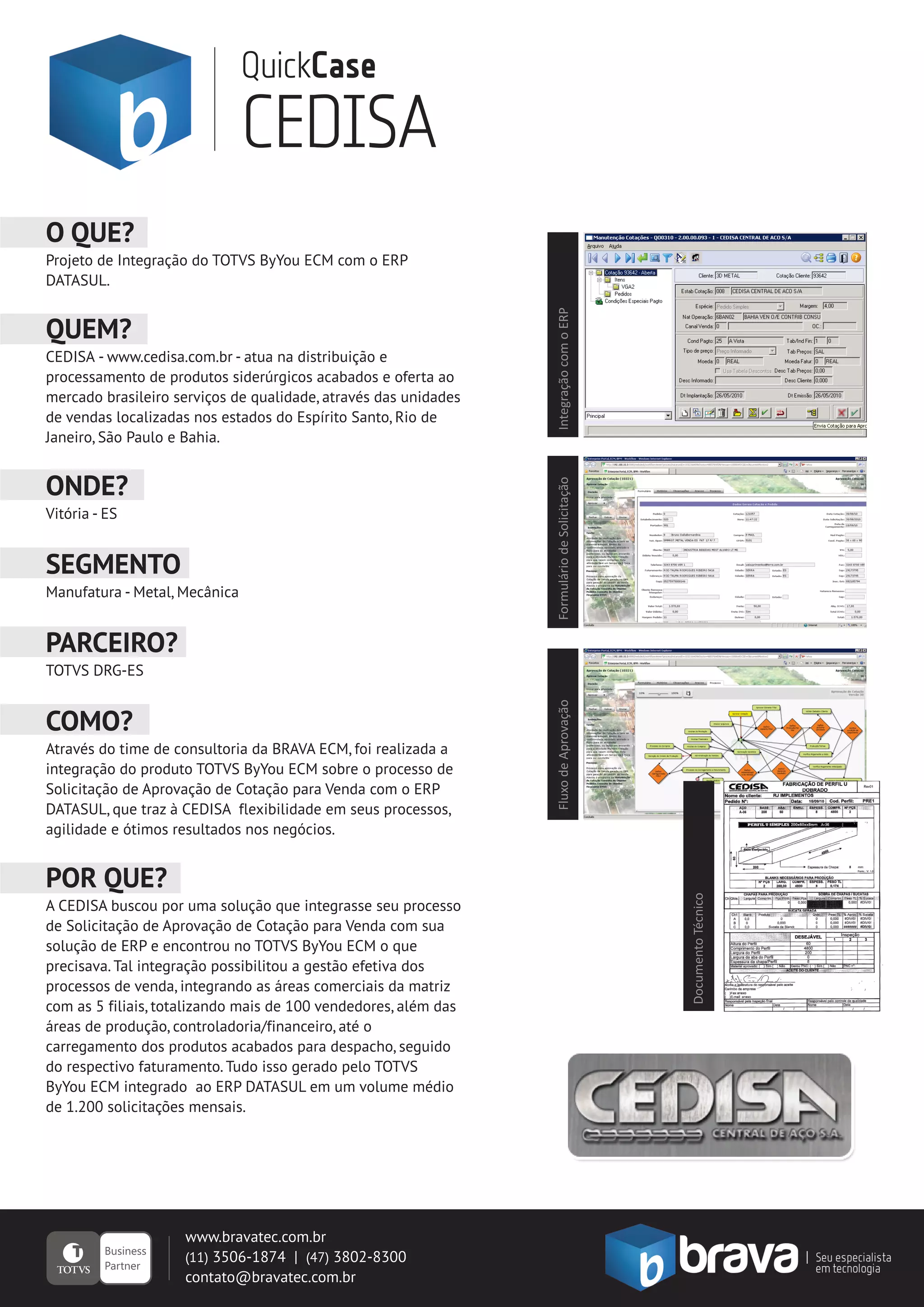 O documento descreve um projeto de integração entre o sistema ECM TOTVS ByYou e o ERP DATASUL da empresa CEDISA para automatizar o fluxo de aprovação de cotações de vendas, permitindo a gestão dos processos de vendas entre a matriz e 5 filiais. A integração fornece agilidade e flexibilidade aos processos da empresa, que realiza em média 1.200 solicitações de cotação por mês.