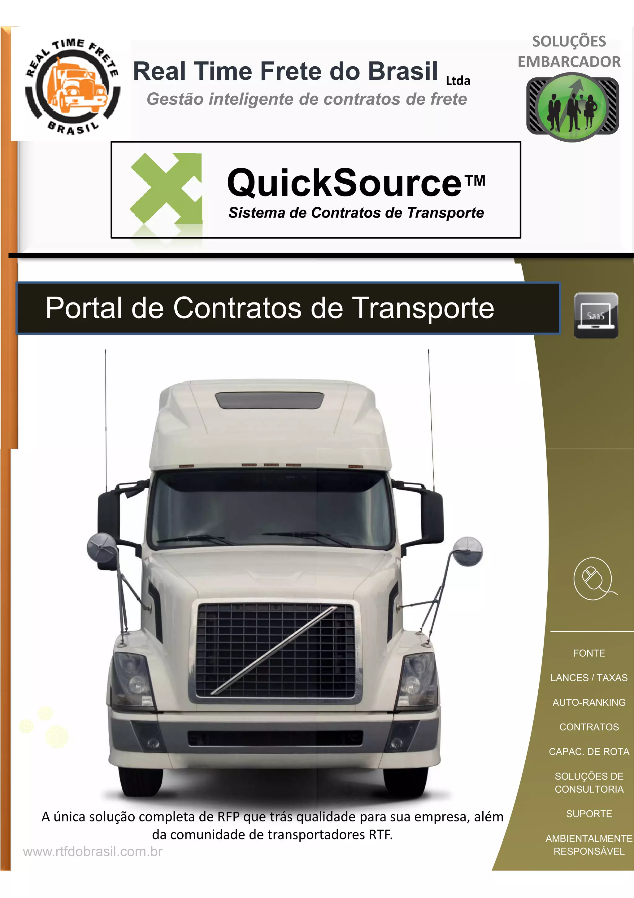 O documento descreve o sistema QuickSource da Real Time Freight, que permite aos clientes realizar eventos de solicitação de proposta (RFP) online para contratar transportadoras. O sistema fornece análises de taxas de mercado, classificação automática de propostas e alertas quando as taxas contratadas estiverem fora da média do mercado. A solução visa reduzir custos e aumentar a eficiência no processo de RFP.