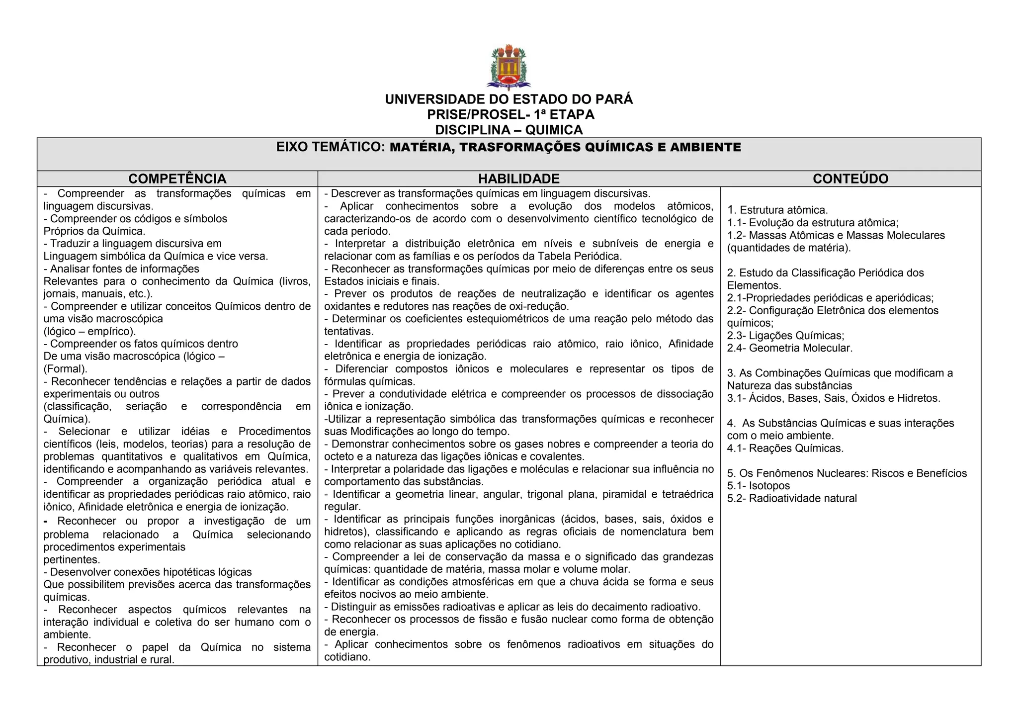 Este documento apresenta os objetivos, habilidades e conteúdos de uma disciplina de Química no ensino superior. Serão abordados tópicos como estrutura atômica, classificação periódica, ligações químicas, reações químicas, cálculos estequiométricos, soluções, termoquímica e cinética química. Os estudantes desenvolverão competências para compreender transformações químicas, utilizar a linguagem simbólica da Química e reconhecer aspectos quí