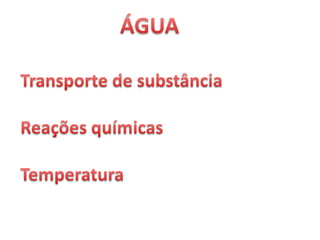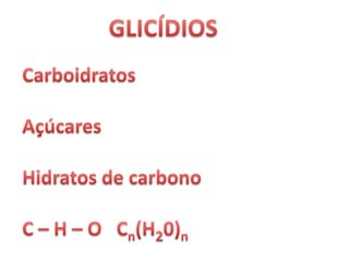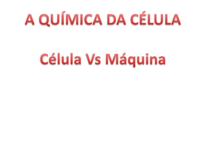 O documento descreve a composição química da célula, incluindo água, sais minerais, carboidratos, proteínas, lipídios e ácidos nucléicos. É detalhado a classificação e funções dos carboidratos, com ênfase em monossacarídeos, oligossacarídeos e polissacarídeos. Também descreve a classificação, função e tipos de lipídios, incluindo glicerídeos, esteroides e seus exemplos animais e vegetais.