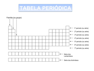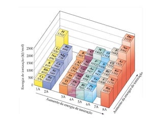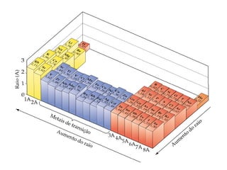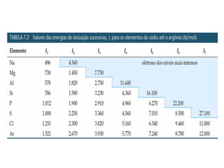O documento apresenta a tabela periódica dividida em famílias e períodos, descrevendo as propriedades dos metais, ametais e gases nobres. Apresenta também as propriedades periódicas de tamanho atômico, energia de ionização e afinidade eletrônica.
