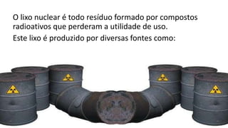O lixo nuclear é produzido por usinas nucleares, armas nucleares e laboratórios médicos. Deve ser manuseado e armazenado com segurança para evitar acidentes ou contaminação, já que pode levar décadas para perder sua radiação e causar doenças. No Brasil, o lixo nuclear é classificado por nível de radioatividade e armazenado em depósitos provisórios ou permanentes.
