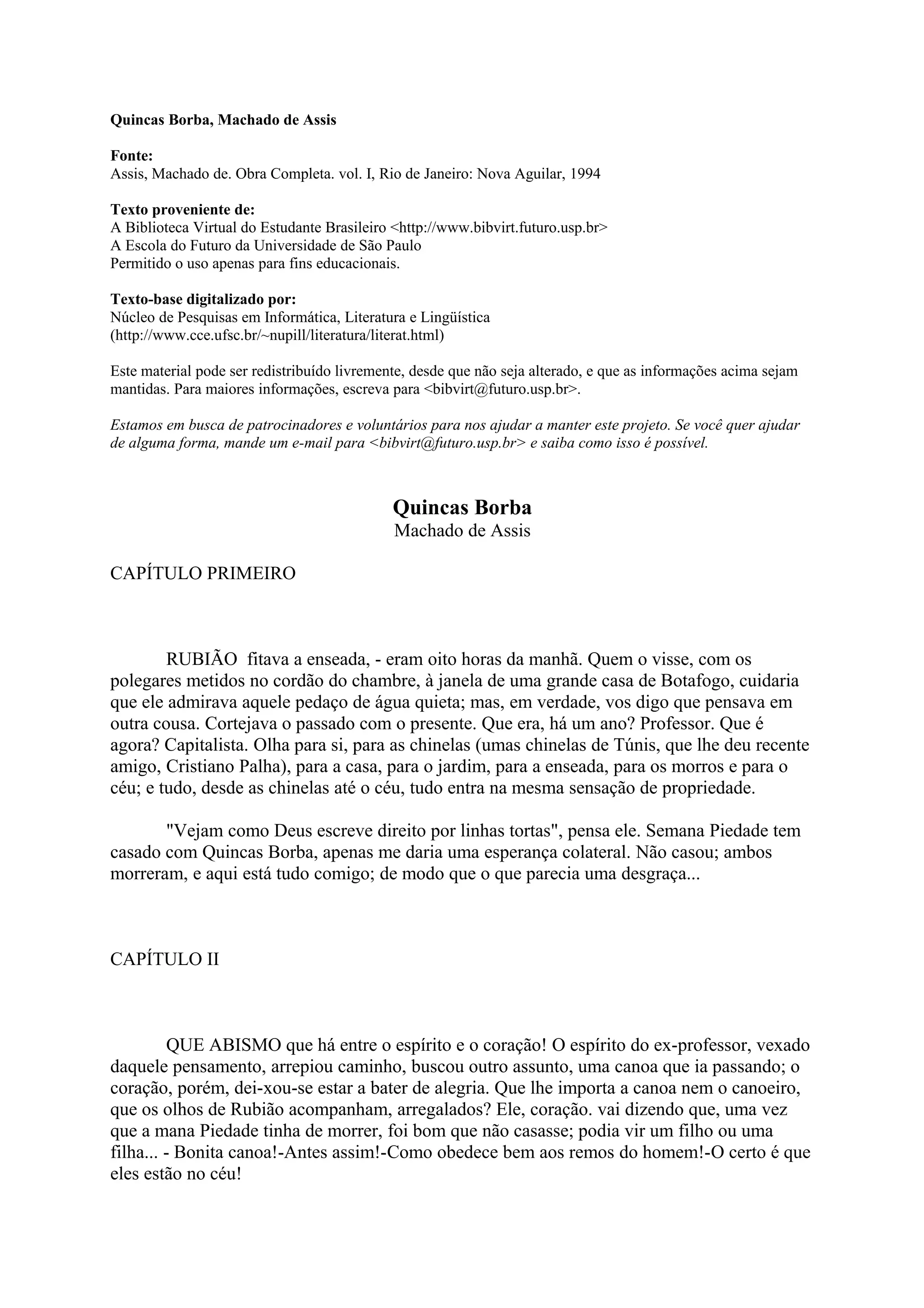 Este resumo descreve o primeiro capítulo do livro "Quincas Borba" de Machado de Assis. Introduz o personagem Rubião, que agora é rico após a morte de seu amigo Quincas Borba e sua irmã. Rubião reflete sobre como sua vida mudou de professor para capitalista e proprietário. Ele também pensa em Sofia, esposa de seu amigo Cristiano Palha.