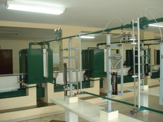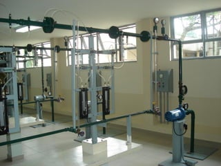 Este documento descreve um experimento para determinar o comprimento equivalente de uma válvula de 1 polegada para diferentes vazões de escoamento. Os resultados experimentais são comparados com valores de tabelas. Além disso, explica como viabilizar um escoamento de 12 m3/h sem trocar a bomba, fechando parcialmente a válvula globo para obter a perda de carga necessária.