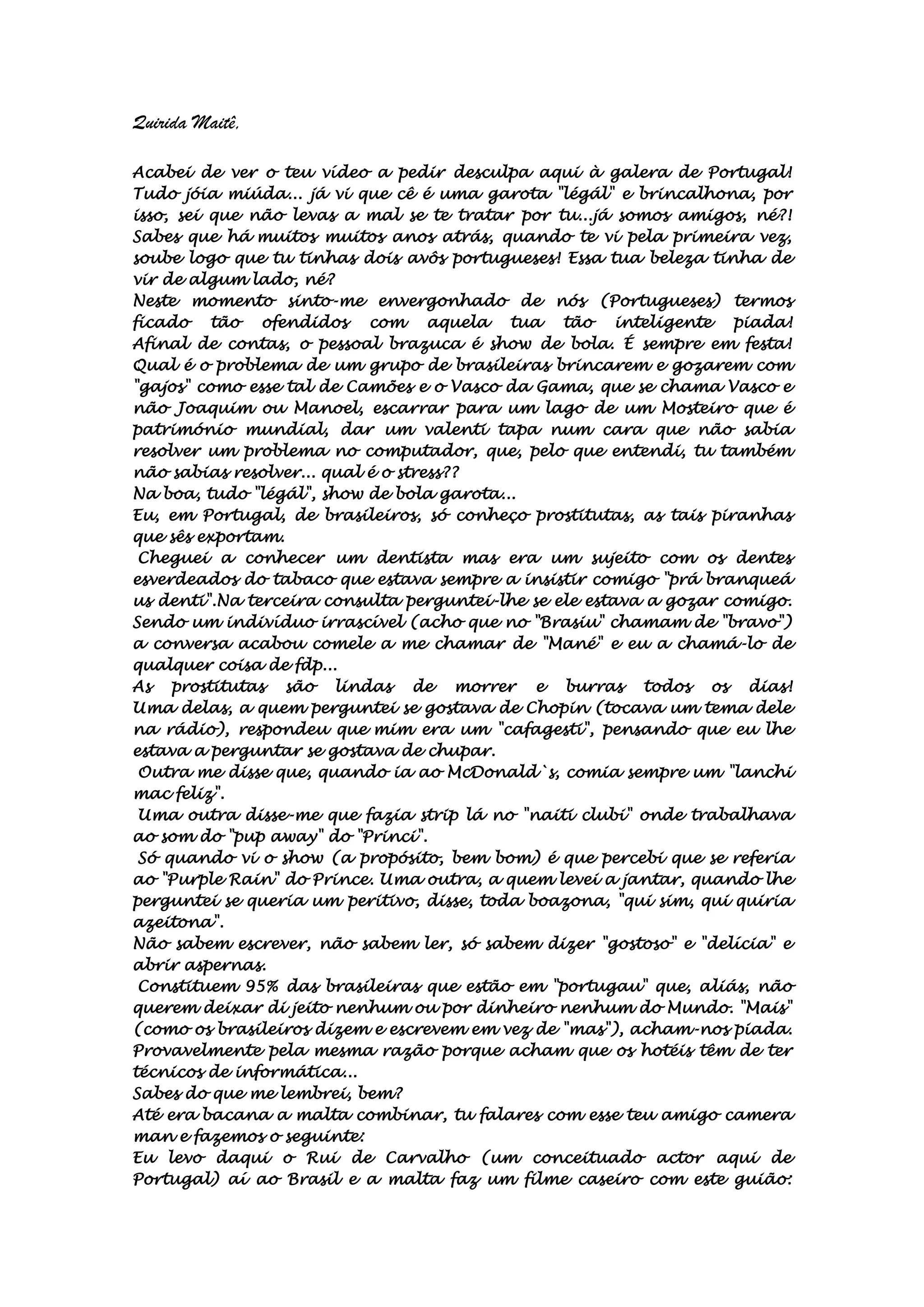 O documento contém um texto de um homem português endereçado a uma brasileira chamada Maitê, sugerindo a realização de um filme caseiro ofensivo e racista contra o Brasil e os brasileiros para vingança por piadas anteriores da brasileira. O homem propõe cenas degradantes e humilhantes com atores portugueses no Brasil para se vingar e lucrar com a transmissão do filme.