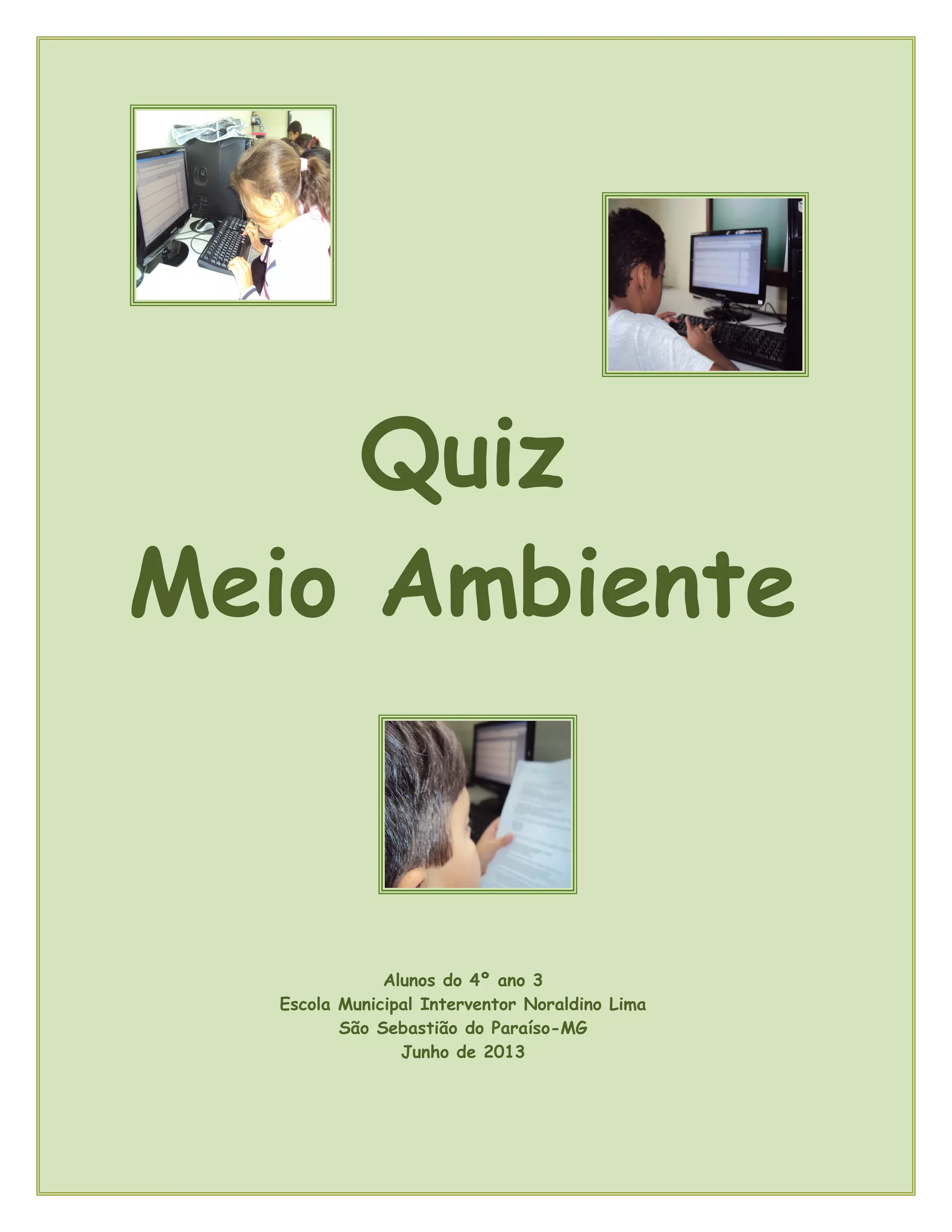 O documento apresenta um quiz sobre meio ambiente elaborado por alunos do 4o ano sobre conteúdos estudados em ciências. O quiz contém 12 questões sobre temas como preservação ambiental, poluição, aquecimento global e conservação de recursos naturais. As questões foram criadas no programa HotPotatoes e disponibilizadas online para que outros alunos pudessem respondê-las.