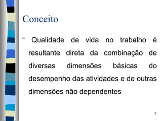 O documento discute o conceito de qualidade de vida no trabalho, definindo-o como resultado da combinação de diversas dimensões do desempenho de tarefas e fatores não relacionados diretamente às tarefas, capazes de produzir motivação e satisfação. Apresenta também o modelo de qualidade de vida no trabalho de Walton, com suas sete dimensões, e discute a associação da qualidade de vida no trabalho com saúde, lazer e nutrição.