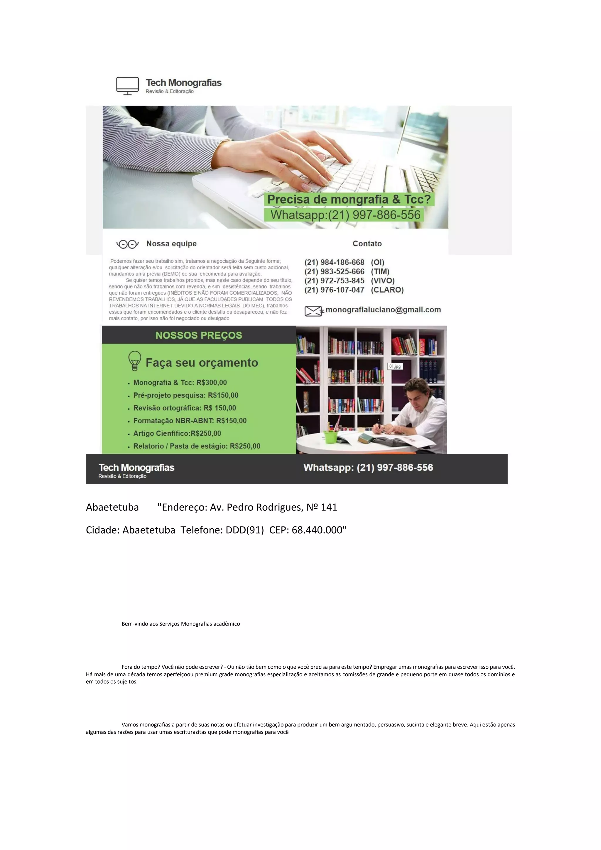 O documento apresenta os serviços de monografias acadêmicas oferecidos por uma empresa. A empresa oferece produção de monografias, trabalhos acadêmicos, dissertações e outros textos para estudantes e profissionais que precisam de ajuda na escrita. Os serviços incluem pesquisa, redação e formatação de acordo com as normas acadêmicas.