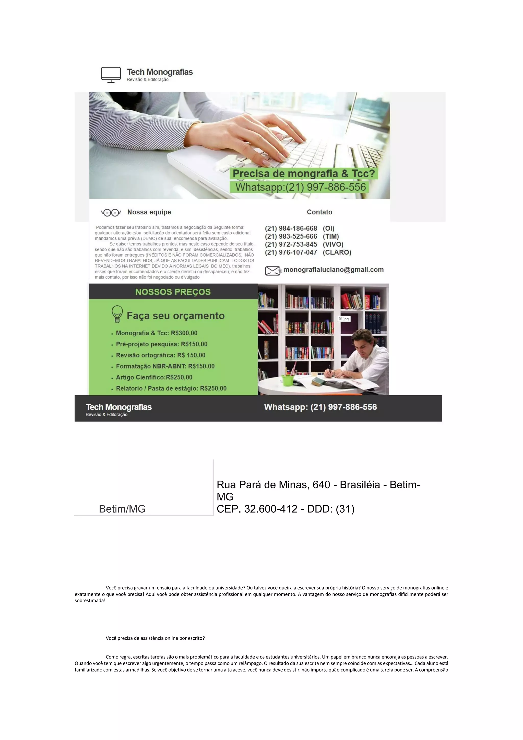 Este documento fornece informações sobre os serviços de monografias online, incluindo a ajuda com ensaios e redações para faculdades e universidades. Ele também discute os benefícios deste serviço, como a qualidade do trabalho e a entrega a tempo. A empresa oferece assistência profissional em vários formatos como monografias, trabalhos acadêmicos e artigos científicos.