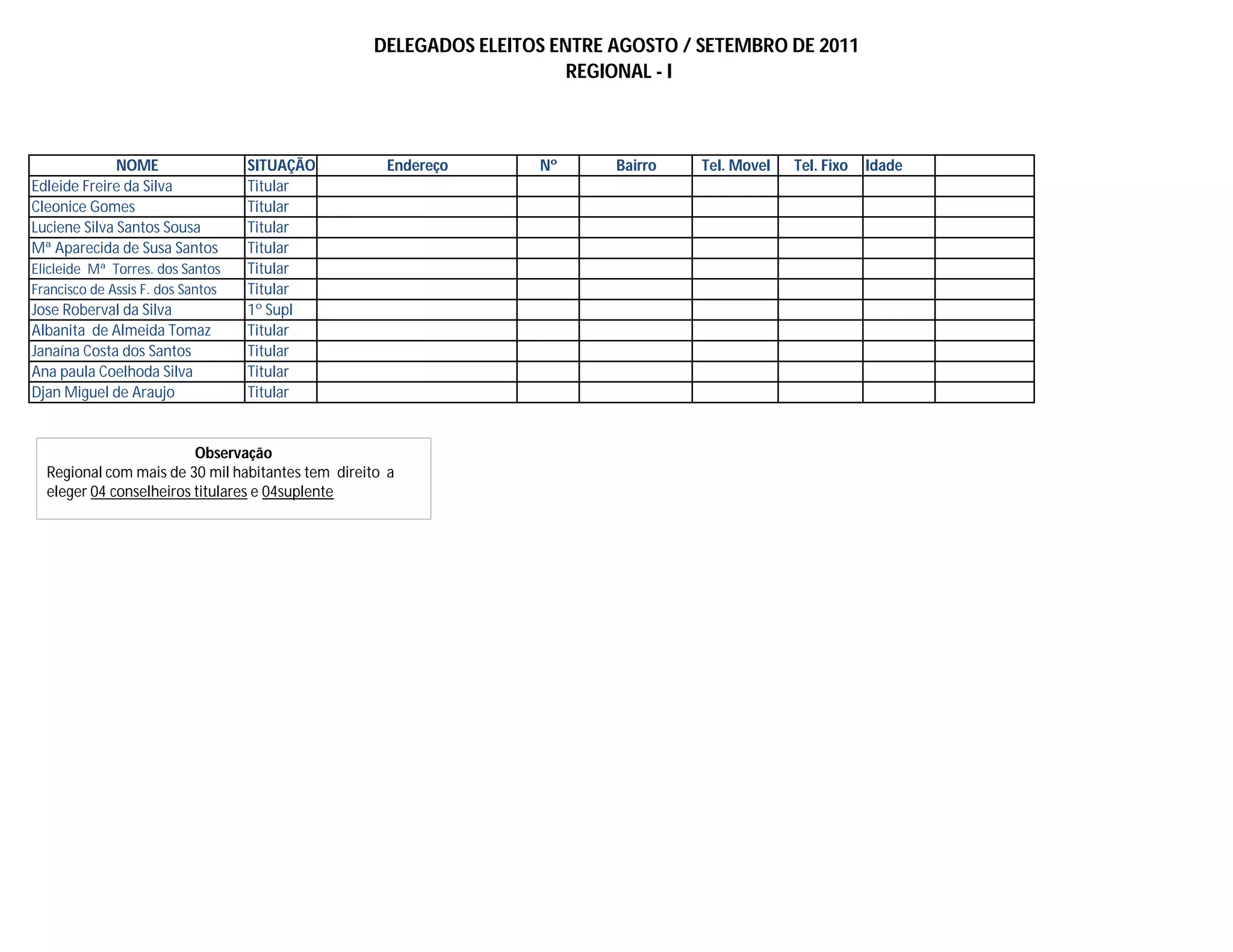 Este documento lista 11 delegados eleitos para o Conselho Regional entre agosto e setembro de 2011, incluindo seus nomes, situações, endereços, números de telefone e idades. A observação indica que a região, com mais de 30 mil habitantes, tem direito a eleger 4 conselheiros titulares e 4 suplentes.