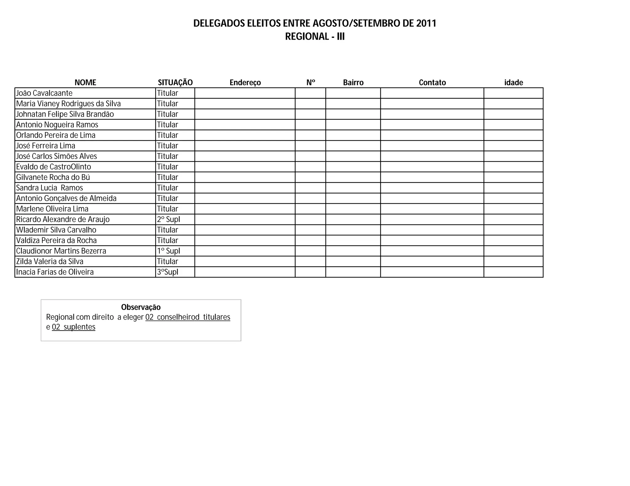 Este documento lista 20 delegados eleitos para a Regional III entre agosto e setembro de 2011, incluindo seus nomes, situações (titular ou suplente), endereços, contatos e idades. A observação no final indica que a Regional tem direito a eleger 2 conselheiros titulares e 2 suplentes.