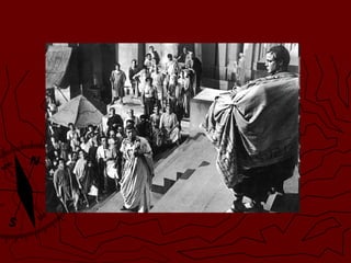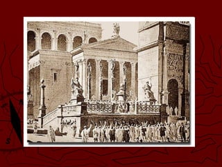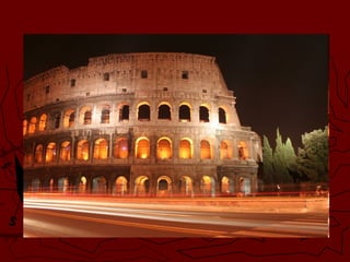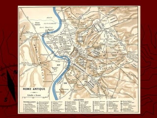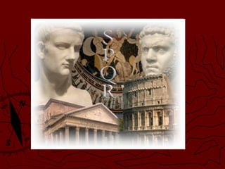 O documento descreve a história da sociedade e do governo da Roma Antiga. Detalha as classes sociais que compunham a sociedade romana (patrícios, clientes, plebeus e escravos) e discute as revoltas plebéias que ocorreram entre os séculos V e III a.C. para conquistar mais direitos políticos e econômicos. Finalmente, aborda brevemente o declínio do Império Romano nos séculos V d.C. devido aos ataques bárbaros.