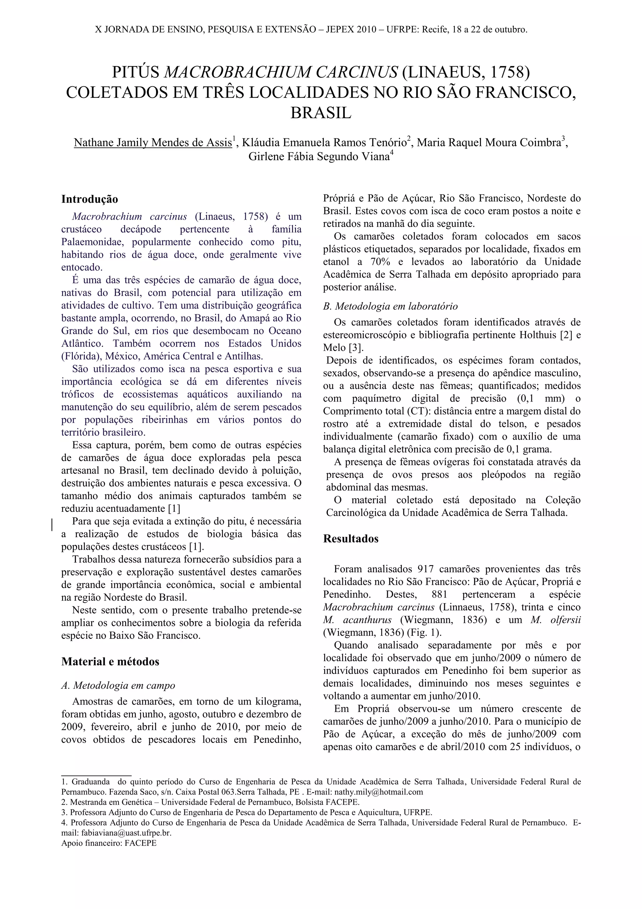 O documento descreve um estudo sobre a biologia do camarão Macrobrachium carcinus em três localidades no Rio São Francisco no Brasil entre junho de 2009 e junho de 2010. Foram coletados 917 camarões, a maioria M. carcinus. O tamanho variou ao longo do tempo e entre locais, com fêmeas geralmente maiores que machos. Foram encontradas fêmeas ovígeras em alguns meses, indicando atividade reprodutiva. Os resultados fornecem informações sobre a dinâmica populacional da espécie.