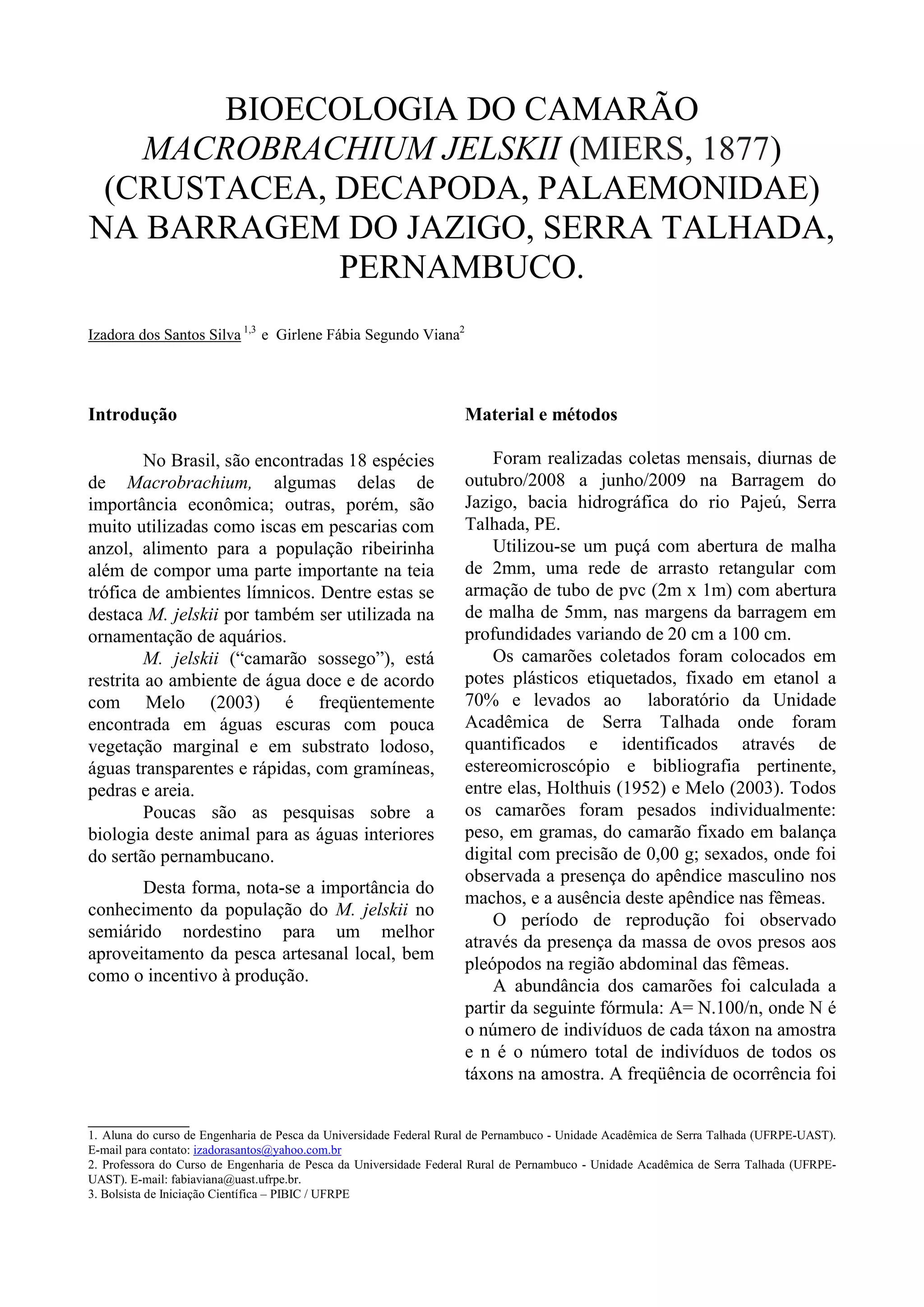 O estudo analisou a população de Macrobrachium jelskii na Barragem do Jazigo em Pernambuco entre outubro de 2008 e junho de 2009. M. jelskii foi encontrado em grande quantidade e frequência. O número de fêmeas foi maior que machos e os meses de fevereiro a junho tiveram mais fêmeas ovígeras. A relação comprimento-peso mostrou correlação positiva para ambos os sexos.