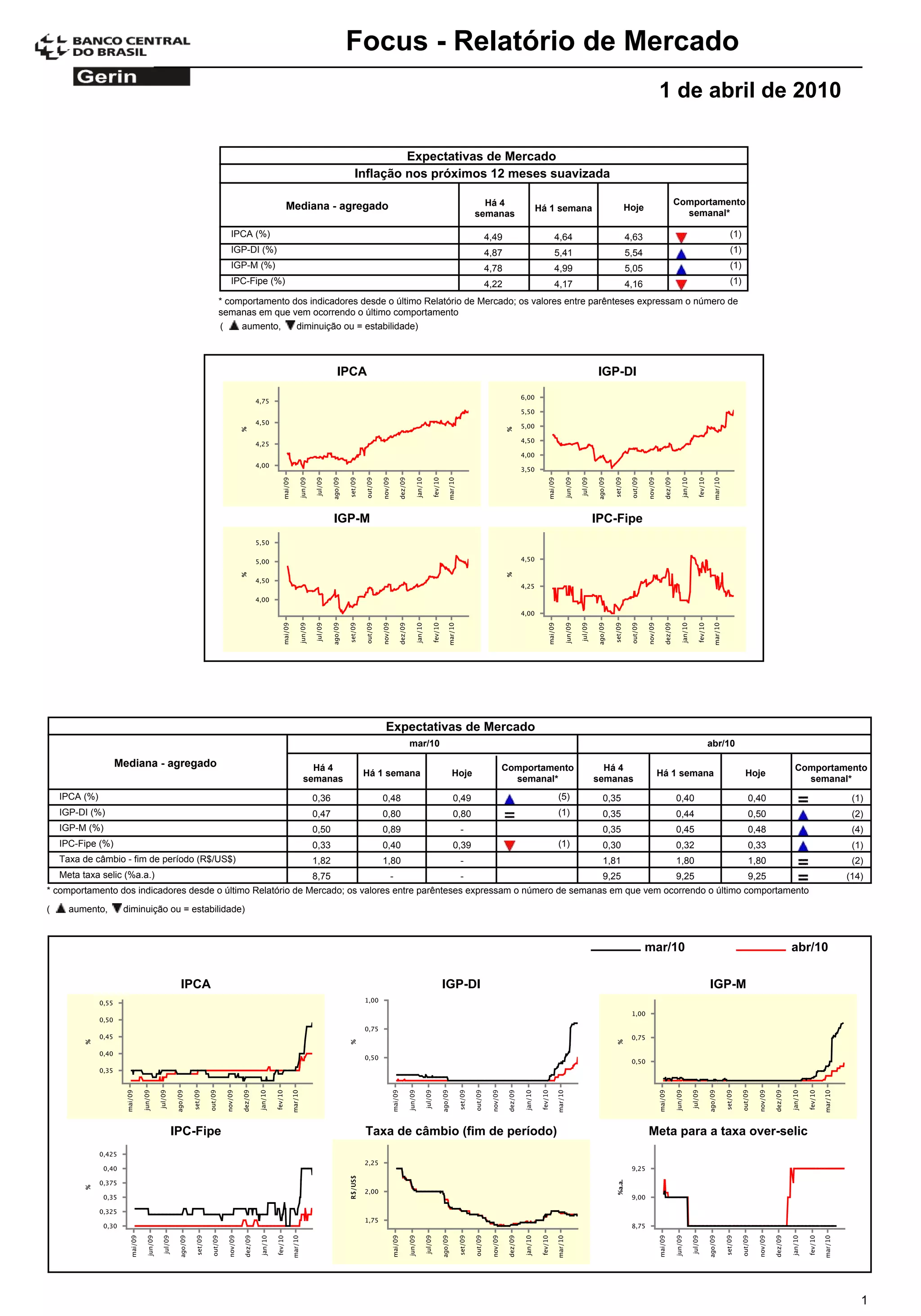 O relatório apresenta as expectativas de mercado para os próximos 12 meses e anos de 2010 e 2011. As projeções indicam uma leve alta da inflação e taxa de câmbio e estabilidade da meta da taxa Selic nos próximos períodos.