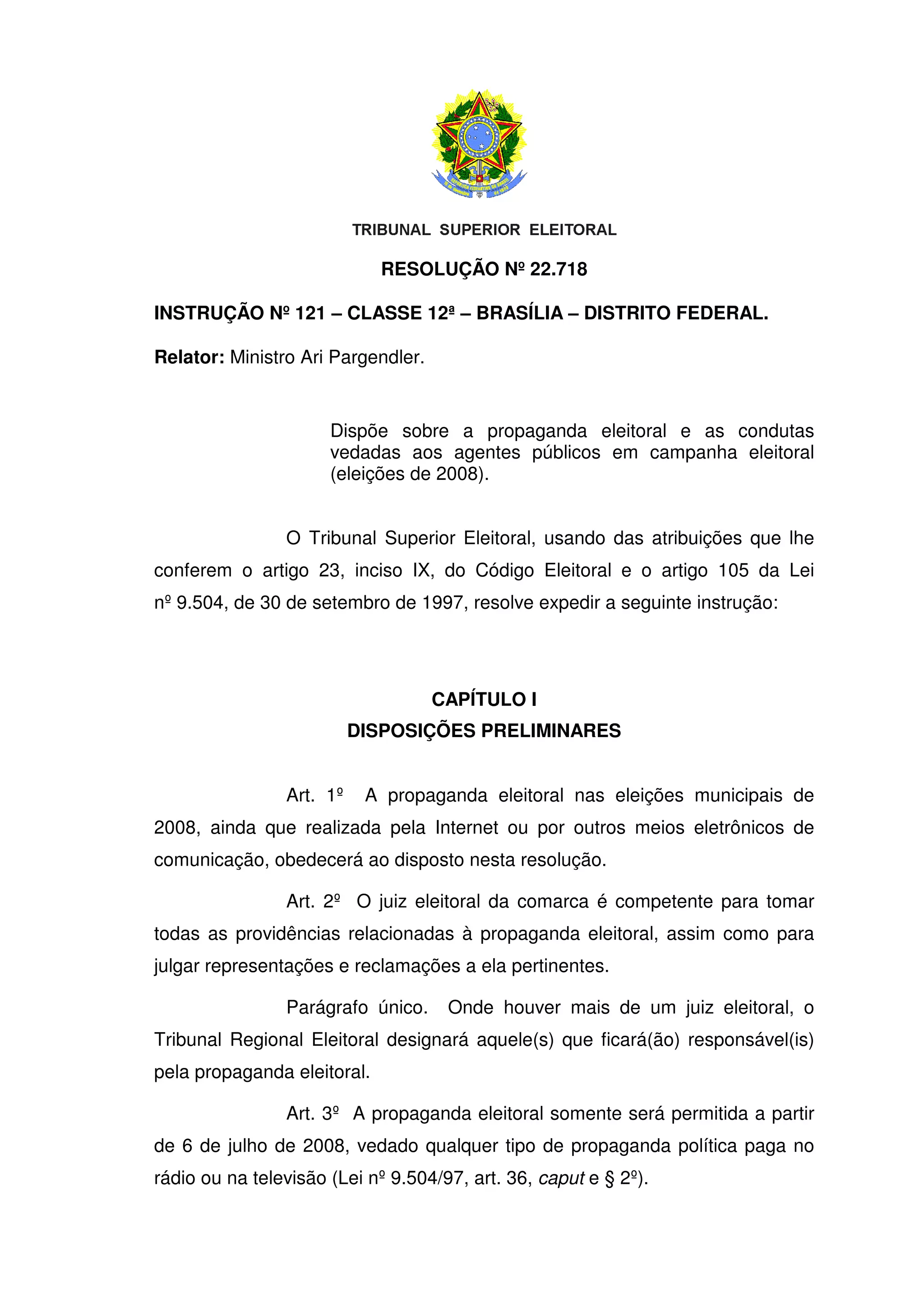 Esta resolução do Tribunal Superior Eleitoral estabelece regras para propaganda eleitoral e condutas vedadas a agentes públicos nas eleições municipais de 2008 no Distrito Federal, incluindo: 1) proibição de propaganda paga no rádio e TV a partir de 6 de julho; 2) permissão de propaganda intrapartidária na quinzena anterior à convenção partidária; 3) proibição de propaganda partidária gratuita a partir de 1o de julho.