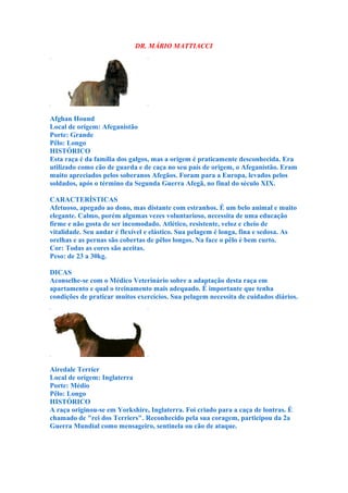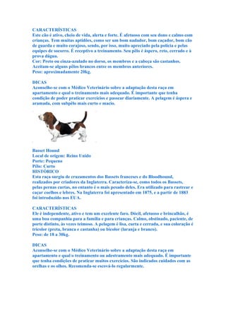 O documento fornece informações sobre diferentes raças de cães, incluindo sua origem, características físicas e dicas sobre cuidados. Resume 15 raças diferentes, descrevendo brevemente cada uma delas.