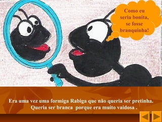 Uma formiga chamada Rabiga queria ser branca ao invés de preta por ser vaidosa. Ela entrou em um saco de farinha para ficar branca, mas as outras formigas acharam que ela era farinha e tentaram levá-la, até que ela falou e assustou as outras formigas. Rabiga aprendeu que é melhor ser uma formiga preta.