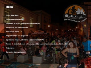 Este documento fornece informações sobre o evento Tavira Bike Race, uma prova de BTT noturna em Tavira. O documento detalha o programa da prova, regulamentos, percurso de 5km, zonas de apoio, alojamento e contactos da organização.