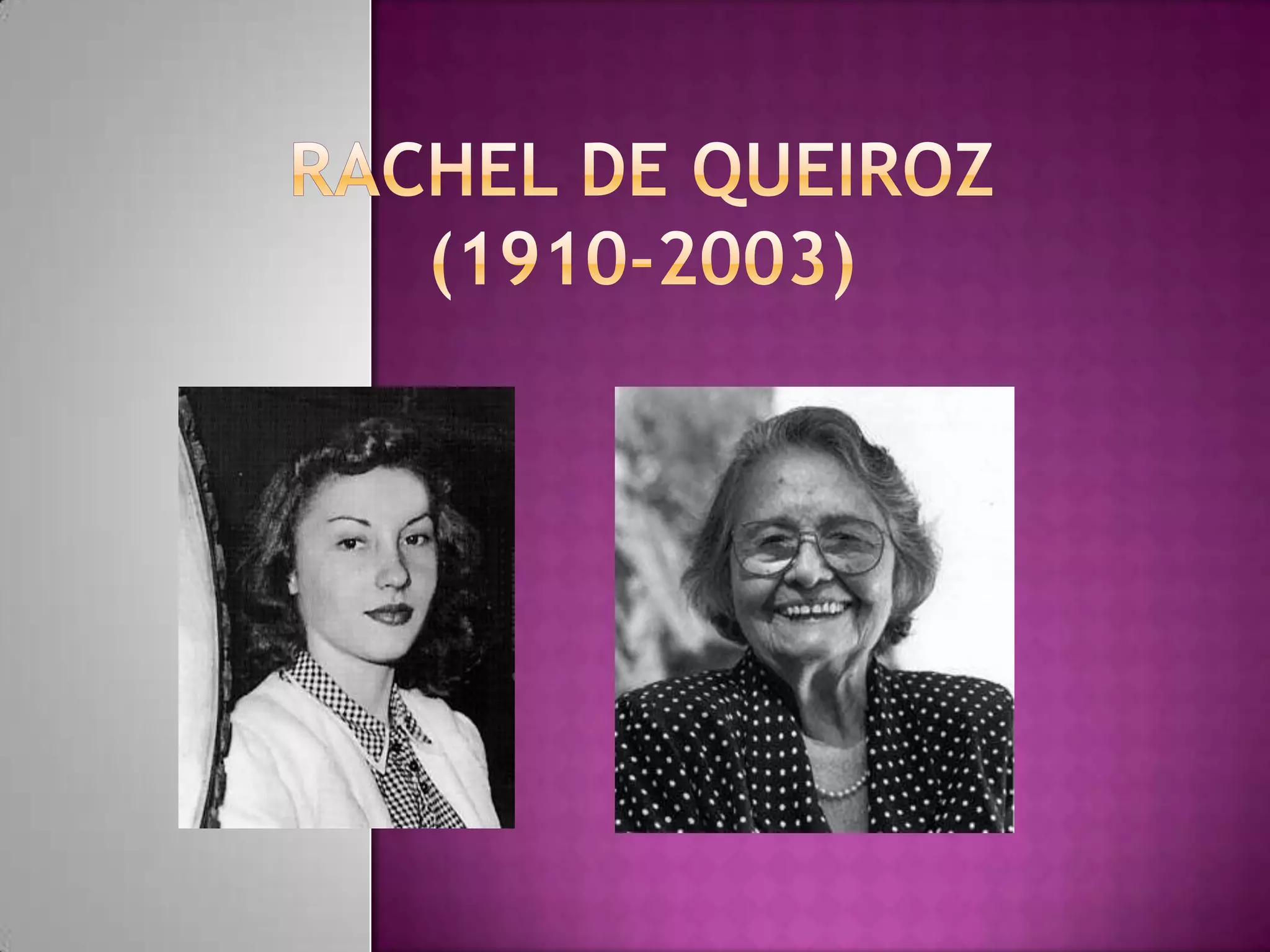 Rachel de Queiroz foi uma escritora brasileira do século XX, primeira mulher eleita para a Academia Brasileira de Letras. Seu primeiro romance "O Quinze" retrata a seca no nordeste brasileiro e suas consequências, utilizando uma linguagem simples e realista. O romance apresenta personagens que lutam contra a pobreza e a fome durante a seca de 1915 no Ceará.