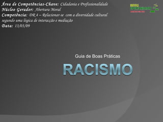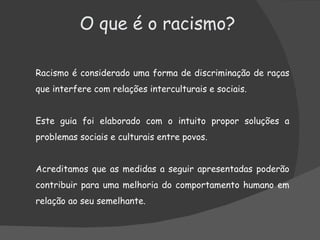 Este guia propõe soluções para problemas sociais e culturais entre povos, promovendo a igualdade e não-discriminação entre raças. Recomenda frequentar locais com diversidade, tratar todos com igualdade, seguir exemplos não-violentos de integração e não discriminação, e garantir iguais oportunidades para todas as pessoas.