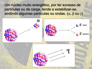 O documento discute como núcleos instáveis tendem a se estabilizar emitindo partículas ou ondas, e menciona reações em cadeia, fissão e fusão nuclear. Também aborda os benefícios e riscos do uso de energia nuclear, incluindo bombas atômicas, acidentes em Chernobyl e Goiânia, e os ataques nucleares a Hiroshima e Nagasaki.