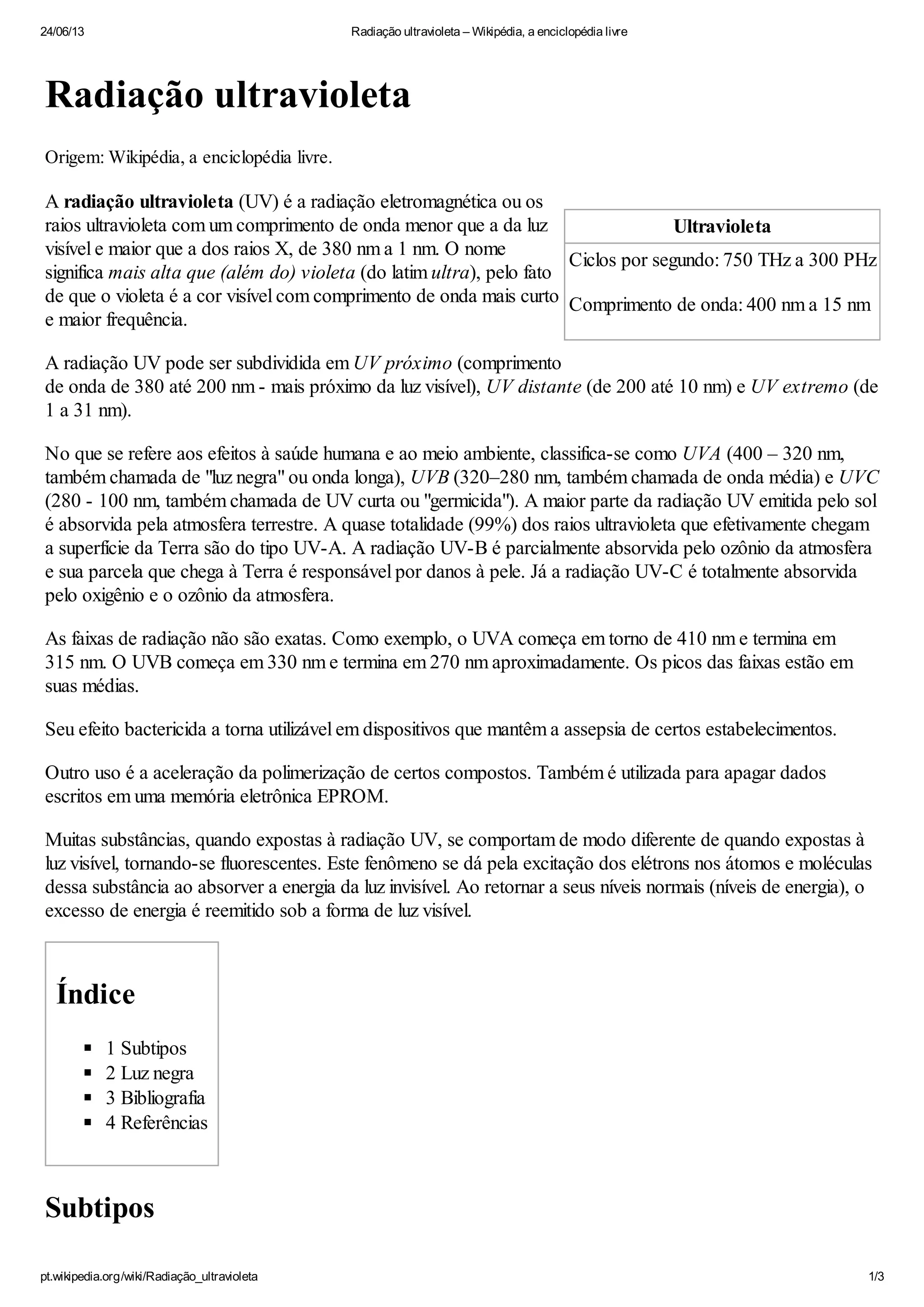 A radiação ultravioleta (UV) é a radiação eletromagnética com comprimento de onda menor que a luz visível e maior que os raios-X, entre 380 nm e 1 nm. Ela pode ser dividida em UVA, UVB e UVC, que têm diferentes capacidades de penetração na atmosfera e efeitos na saúde e meio ambiente. A radiação UV pode causar fluorescência em certas substâncias e tem usos como desinfecção e aceleração de reações químicas.