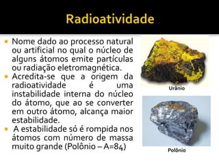 1. A radioatividade ocorre quando átomos instáveis emitem radiação ao se desintegrarem para formas mais estáveis.