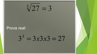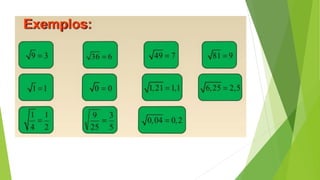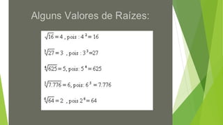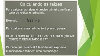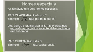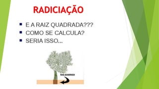 O documento discute conceitos básicos de radiciação, incluindo a relação com potenciação, nomenclatura, propriedades, cálculos envolvendo raízes de números grandes ou com índices diferentes, indicação de raízes sem usar o radical, radicais semelhantes, operações com radicais e racionalização.
