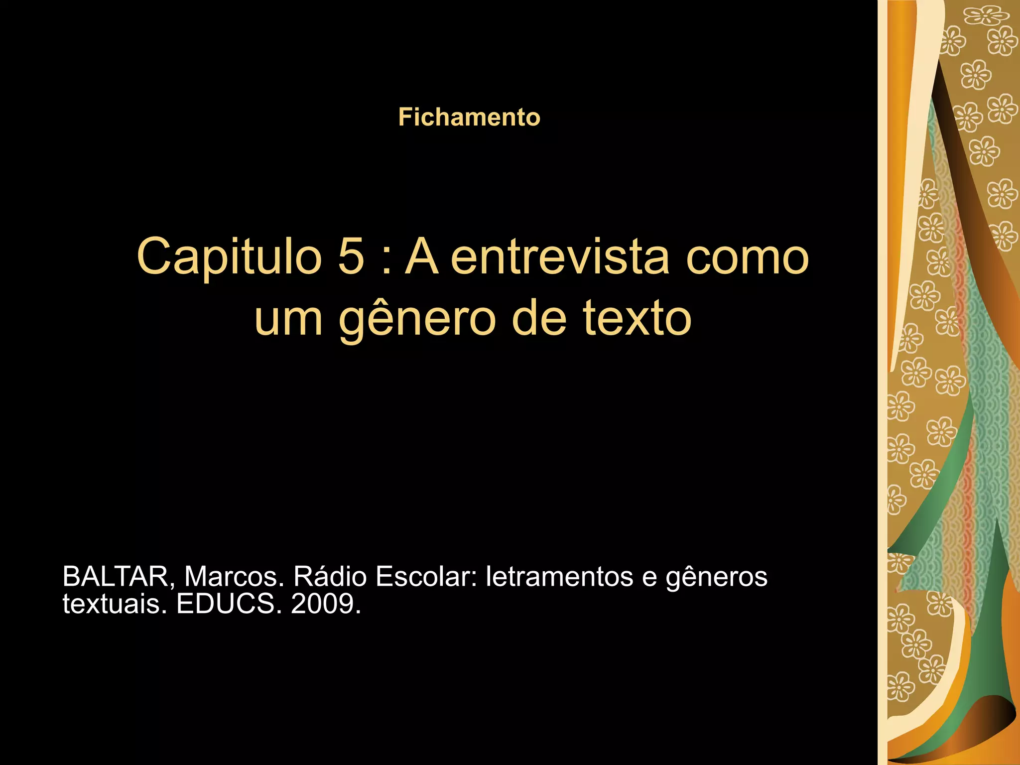 O documento discute o gênero textual da entrevista, definindo-a como uma interação entre entrevistador, entrevistado e público sobre um determinado tema. Apresenta características da entrevista radiofônica e tipos de entrevistas de acordo com objetivos, estrutura e circunstâncias. Por fim, sugere um trabalho de entrevista na rádio escolar.