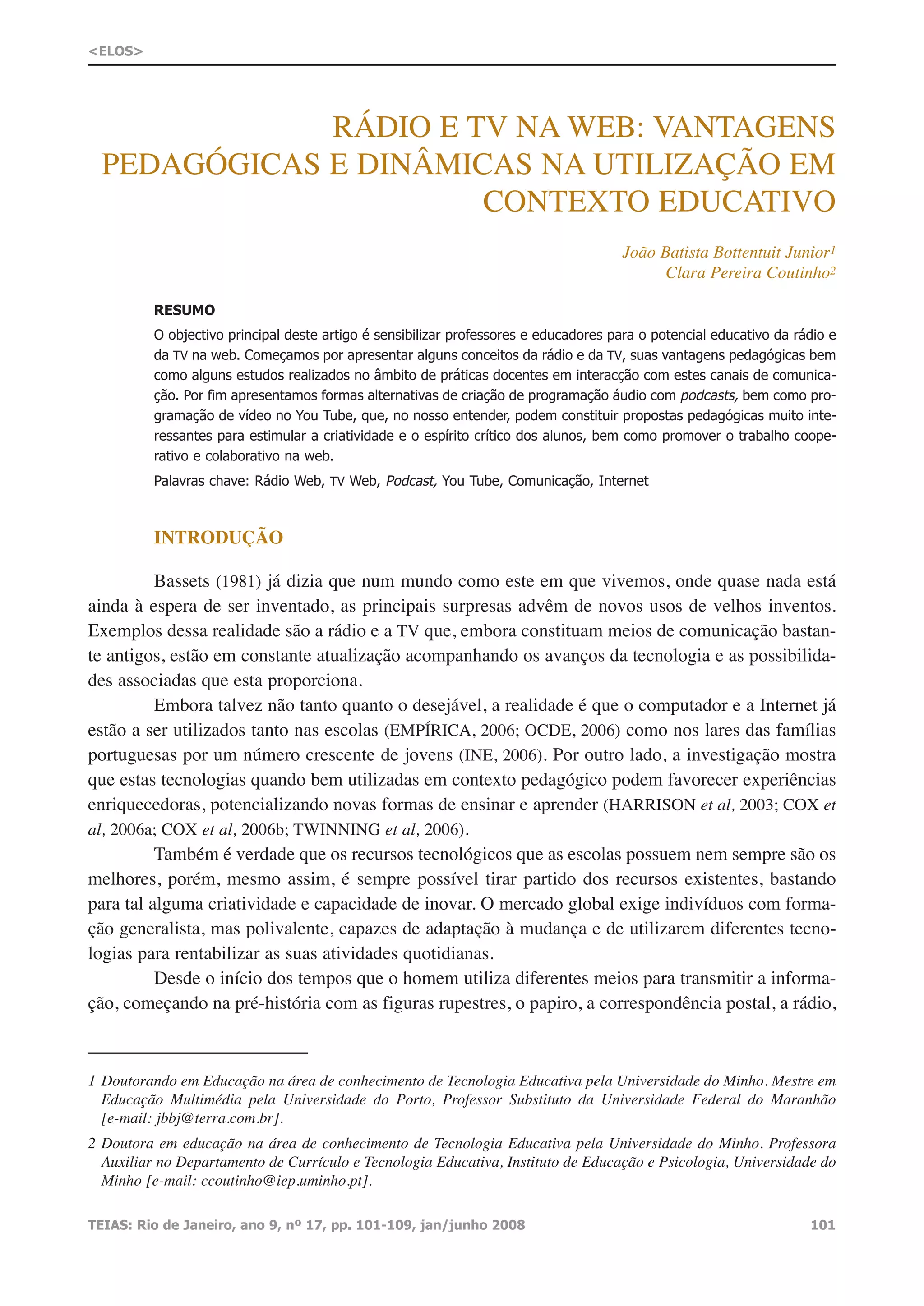 O documento discute o potencial educativo do uso da rádio e TV na web em contextos educacionais. Apresenta conceitos sobre rádio e TV na internet e exemplos de seu uso no Brasil e Portugal. Destaca vantagens pedagógicas como incentivar leitura, oratória e pesquisa; ampliar comunicação e reflexão crítica; e permitir aprendizagem colaborativa e difusão de conteúdo a nível global.