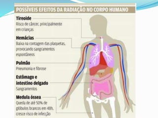 O documento discute vários tópicos relacionados a radiação e energia nuclear, incluindo tipos de radiação atômica, reações nucleares de fissão e fusão, medidas de radiação, radiação natural, meia-vida, aplicações de radiação, enriquecimento de urânio, usinas nucleares, acidentes nucleares e seus efeitos na saúde humana.