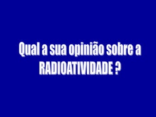 O documento discute o uso da radioatividade na medicina, agricultura, arqueologia, geologia e como fonte de energia. A radioatividade é usada no diagnóstico e tratamento de doenças, na datação de fósseis e rochas, e na geração de energia em reatores nucleares. Os principais tipos de radiação são alfa, beta e gama.