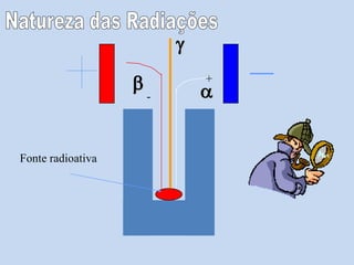 α Radiação alfa: é uma partícula formada por um átomo de hélio com carga positiva. A distancia que uma partícula percorre Antes de parar é chamada alcance. Num dado meio, partículas alfa de igual energia têm o mesmo alcance. O alcance das partículas alfa É muito pequena, o que faz com que ela sejam facilmente blindadas. Uma folha fina de alumínio barra completamente um feixe de Partículas de 5 MeV. A inalação ou ingestão de partículas é muito perigosa.β Radiação beta : é também uma partícula, de carga negativa, o elétron. Sua constituição é feita por partículas beta que são Emitidas pela maioria dos nuclideos radioativos naturais ou artificiais e tem maior penetração que as partículas alfa. O 32 P dá Da um a radiação beta ate 1,7 MeV com uma penetração media de 2 á 3 mm na pele, e alcança, em pequena proporção, 8 mm. Se o emissor beta é ingerido, como acontece nos casos de diagnósticos e terapêutica, os efeitos são muitos mais extensas.γ Radiação gama: é uma onda eletromagnética. As substancias radiativas emitem continuamente calor e têm a capacidade De ionizar o ar e torná-lo condutor de correte elétrica. São penetrantes e ao atravessarem uma substancia chocam-se com suas Moléculas. A radiação gama tem seus poder de penetração muito grande. Sua emissão é obtida pela maioria, não totalidade, das nuclideos radiativos habitualmente empregados. Quando a fonte de material radioativo for beta ou gama é necessário colocação deUma barreira entre o operador e fonte.