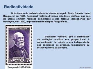 Em 1911 Marierecebeu sozinha o Nobel de Química pela descoberta do Polônio.RadioatividadeO fenômeno da radioatividade foi descoberto pelo físico francês Henri Becquerel, em 1896. Becquerel realizou diversos estudos e verificou que sais de urânio emitiam radiação semelhante à dos raios-X (descobertos por Roentgen, em 1895), impressionando chapas fotográficas.Becquerel verificou que a quantidade de radiação emitida era proporcional à concentração de urânio e era independente das condições de pressão, temperatura ou estado químico da amostra.Renato Semmler