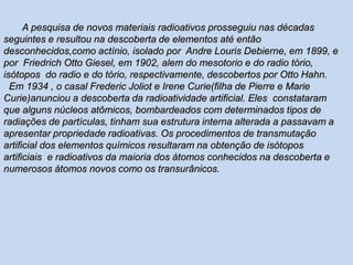 A pesquisa denovos materiais radioativos prosseguiu nas décadas seguintes e resultou na descoberta de elementos até então desconhecidos,como actínio, isolado por Andre Louris Debierne, em 1899, e por Friedrich Otto Giesel, em 1902, alem do mesotorio e do radio tório, isótopos do radio e do tório, respectivamente, descobertos por Otto Hahn. Em 1934 , o casal Frederic Joliot e Irene Curie(filha de Pierre e Marie Curie)anunciou a descoberta da radioatividade artificial. Eles constataram que alguns núcleos atômicos, bombardeados com determinados tipos de radiações de partículas, tinham sua estrutura interna alterada a passavam a apresentar propriedade radioativas. Os procedimentos de transmutação artificial dos elementos químicos resultaram na obtenção de isótopos artificiais e radioativos da maioria dos átomos conhecidos na descoberta e numerosos átomos novos como os transurânicos.