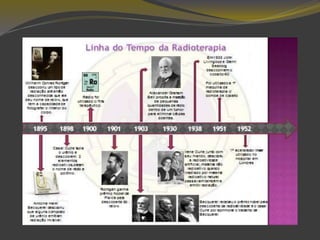 A radioterapia evoluiu da descoberta dos raios-X em 1895 para o tratamento de tumores até se tornar uma especialidade médica reconhecida em 1922. Atualmente, conta com aparelhos de alta precisão que destroem tumores com radiação sem danificar tecidos normais próximos.
