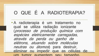 A radioterapia utiliza radiação ionizante para destruir células cancerígenas. Ela pode ser externa, usando aparelhos fora do corpo, ou interna, colocando materiais radioativos no corpo. Os efeitos colaterais comuns incluem fadiga, problemas de pele e outros sintomas dependendo da área tratada, mas a maioria desaparece após o tratamento. A radioterapia é um tratamento eficaz para o controle do câncer em mais da metade dos pacientes.