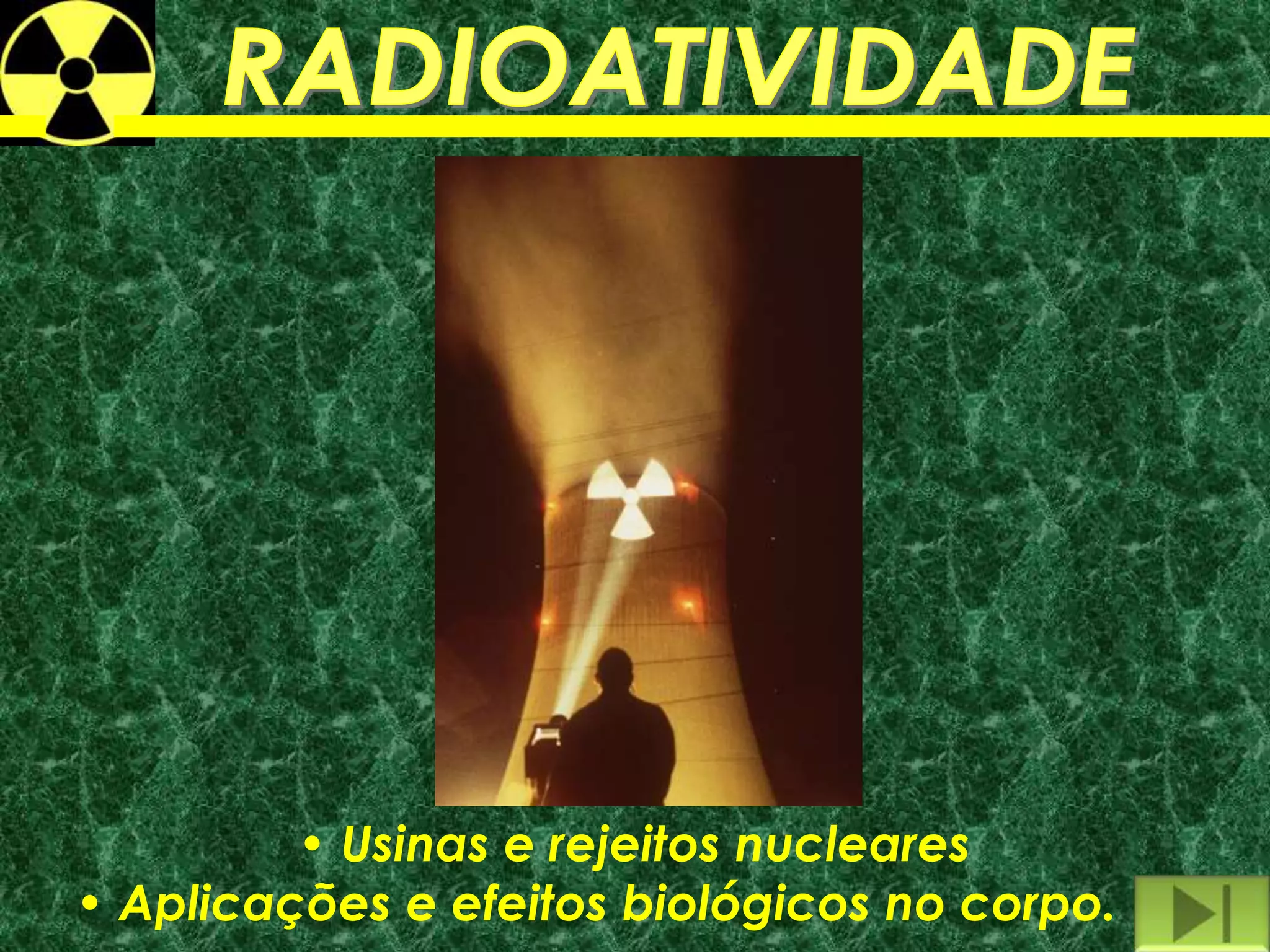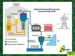O documento discute usinas nucleares, lixo nuclear e os efeitos da radiação no corpo humano. Aborda como as usinas nucleares produzem energia através da fissão nuclear, mas também geram resíduos radioativos perigosos. Explica os riscos de acidentes nucleares e como o lixo nuclear deve ser manuseado e armazenado com segurança para evitar contaminação.