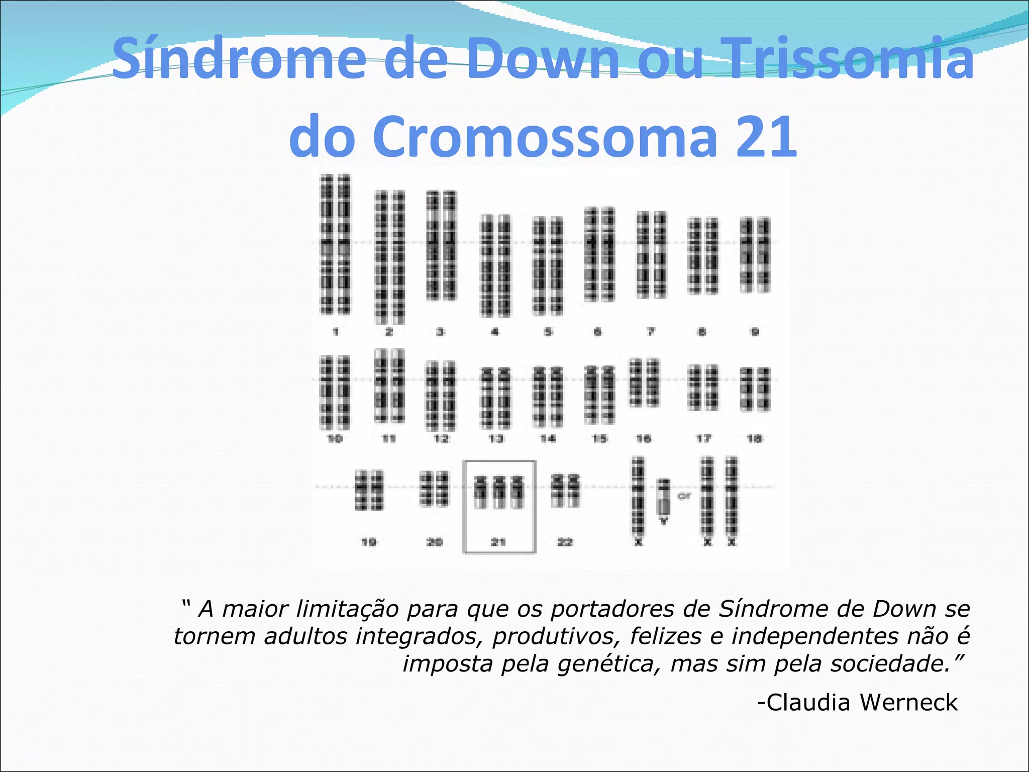 A Síndrome de Down é um distúrbio genético causado pela presença de um cromossomo 21 extra que causa dificuldades no desenvolvimento físico e cognitivo. Embora haja limitações, a maior barreira para a integração dessas pessoas é a atitude da sociedade, não a genética. A síndrome requer estimulação desde cedo para melhorar a qualidade de vida.