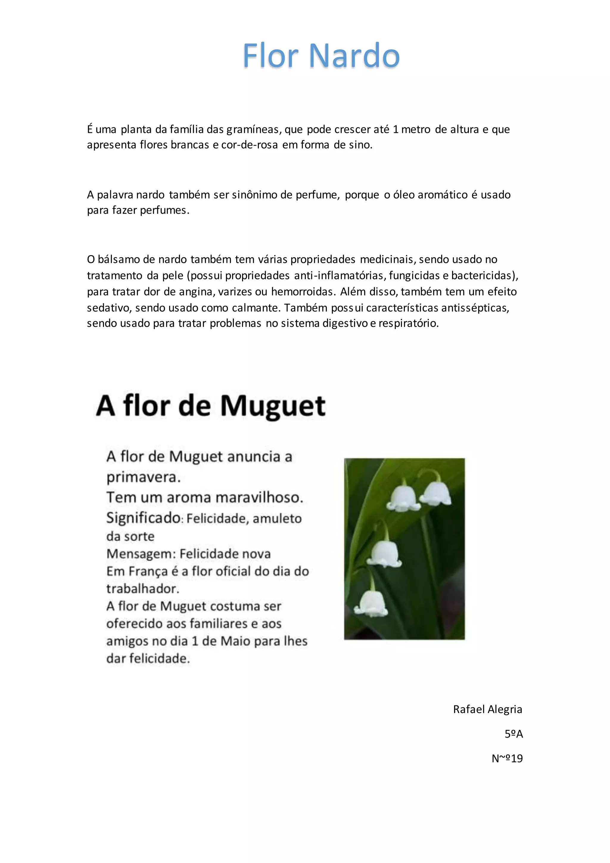 A nardo é uma planta da família das gramíneas que pode crescer até 1 metro de altura, com flores brancas e cor-de-rosa em forma de sino. Seu óleo aromático é usado para fazer perfumes e seu bálsamo possui propriedades medicinais como anti-inflamatório, fungicida, bactericida e sedante, sendo usado no tratamento da pele e de dores, varizes, hemorroidas e problemas digestivos e respiratórios.